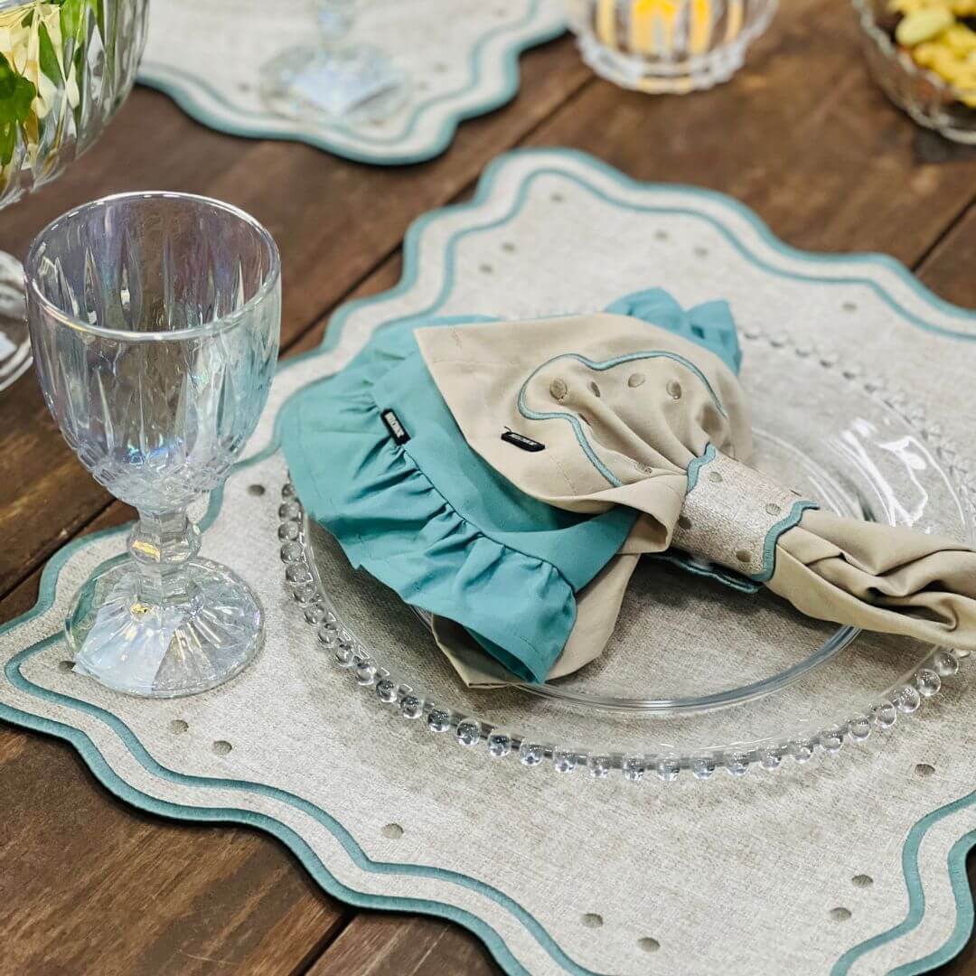 Este kit é uma escolha encantadora para compor uma mesa posta elegante e acolhedora. Os guardanapos em tricoline verde bálsamo apresentam um delicado bordados, conferindo um toque de charme e sofisticação. Acompanha duas argolas decorativas com bordado, que complementam o conjunto com estilo. As fotos apresentam este guardanapo com mais uma opção de guardanapo com babados (disponível aqui em nosso site também).
