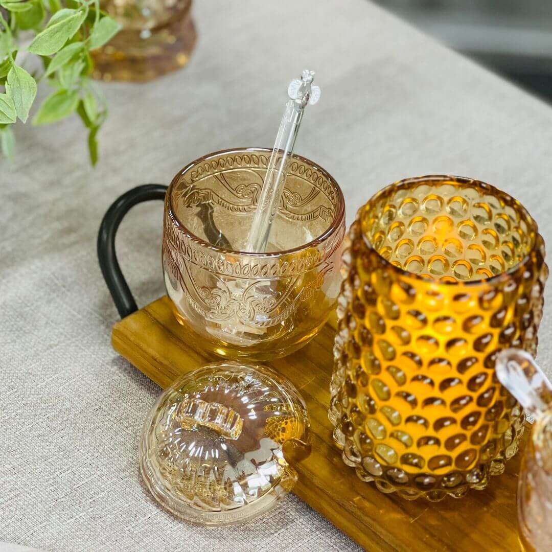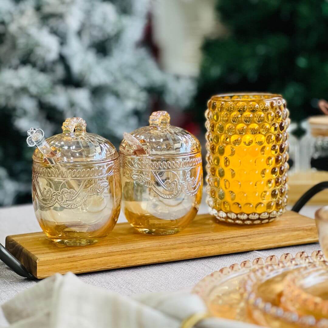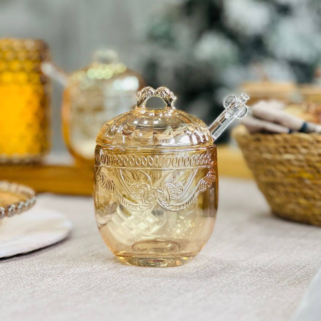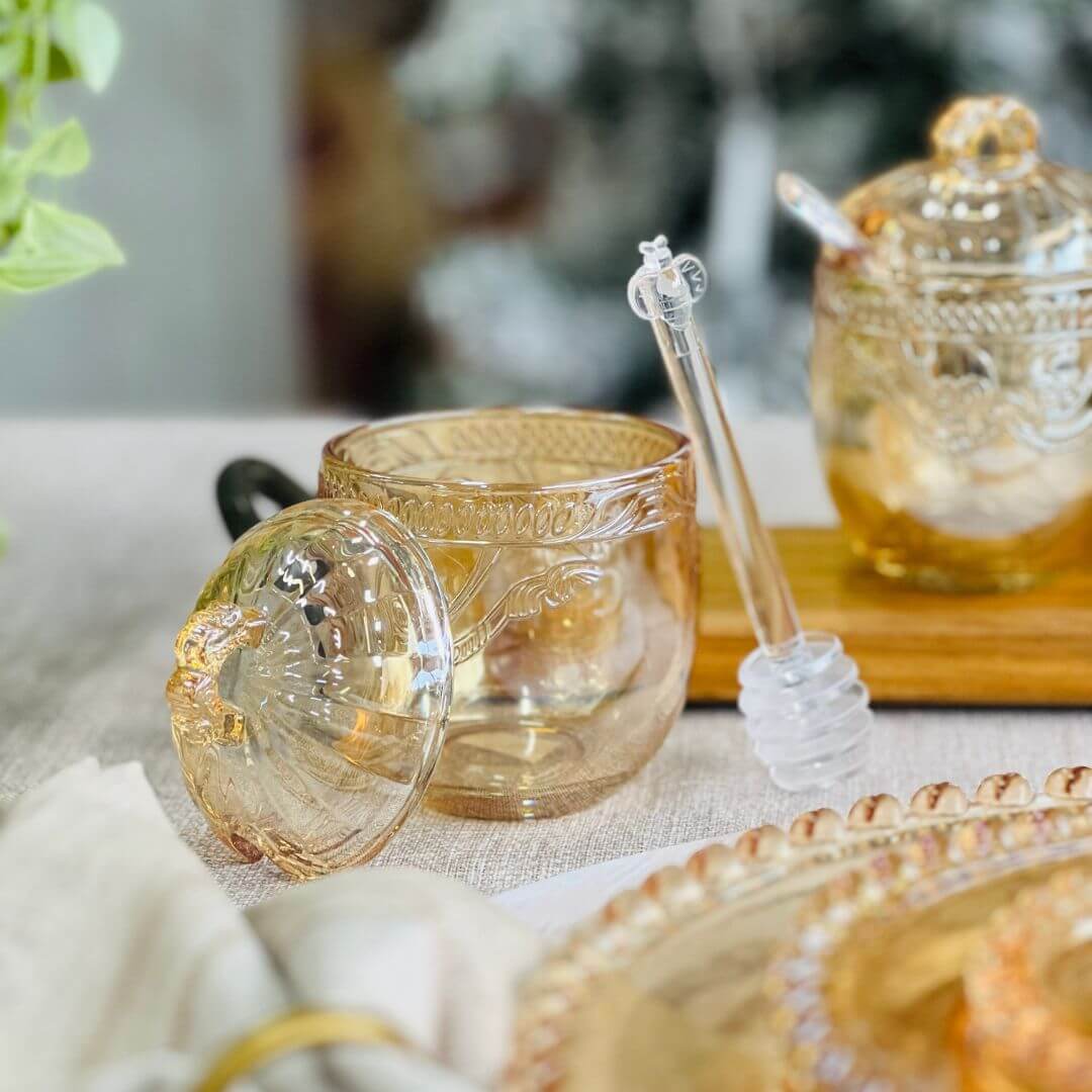 Encante sua mesa com a sofisticação da Meleira Imperial Âmbar Metalizado. Produzida em cristal ecológico com acabamento âmbar metalizado, ela combina elegância e funcionalidade para servir mel com requinte. Acompanha colherinha com uma abelhinha na ponta coordenada que encaixa perfeitamente na borda, garantindo praticidade ao servir.