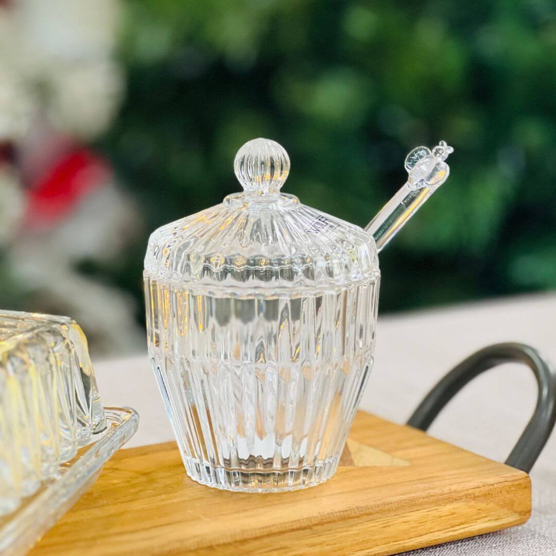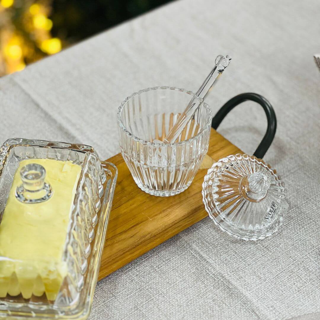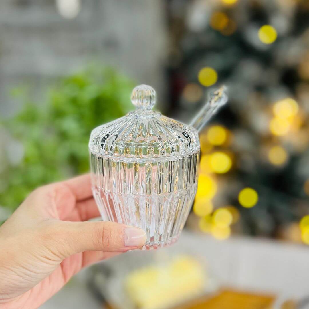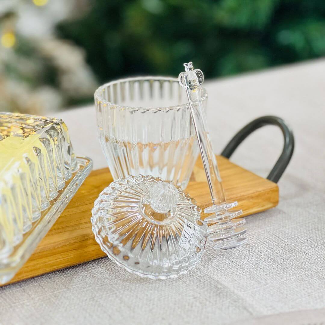 Com design clássico inspirado nas peças de luxo, a Meleira Império une funcionalidade e requinte para sua mesa. Produzida em cristal de alta transparência, possui tampa com puxador esculpido e um pegador delicado que facilita servir o mel com elegância. Ideal para composições de café da manhã, brunch ou chá da tarde.