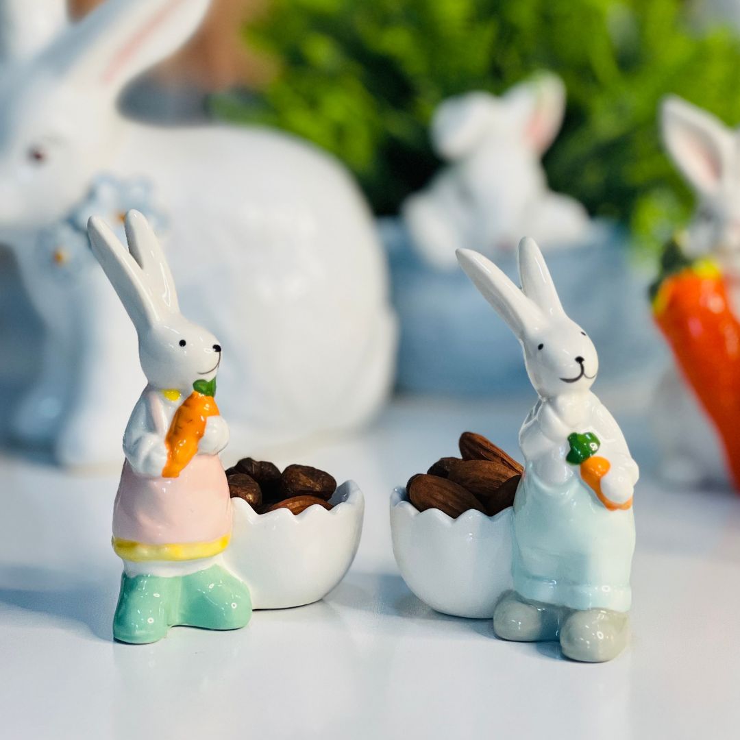 Este adorável mini casal de coelhos traz charme e delicadeza para a sua decoração de Páscoa. Com detalhes cuidadosamente trabalhados com uma cestinha, torna a peça ainda mais encantadora para compor sua mesa ou qualquer ambiente especial.