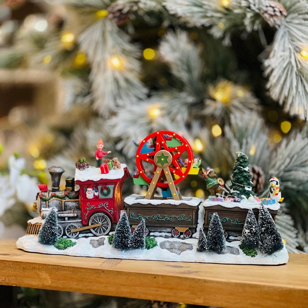 Encante sua decoração natalina com o Parque no Trem, uma peça cheia de vida e magia! Com iluminação em LED, som e movimento, esse cenário é perfeito para criar um ambiente festivo e encantador. Funciona na tomada (bivolt), trazendo praticidade e um espetáculo visual para mesas, aparadores ou composições maiores de Natal.