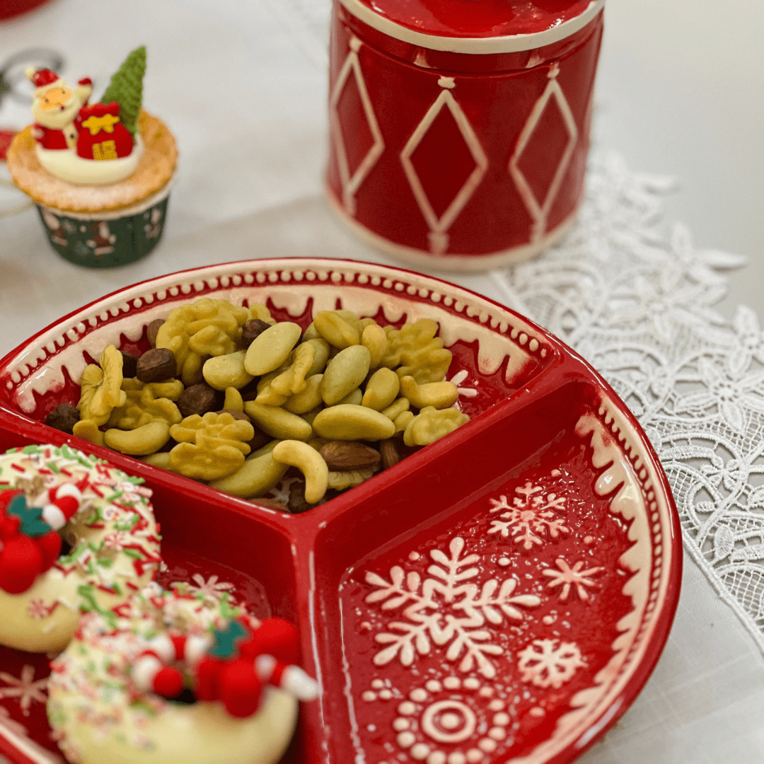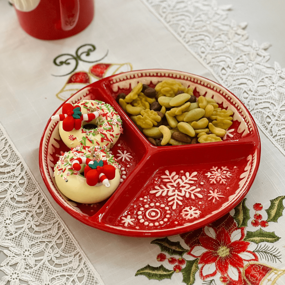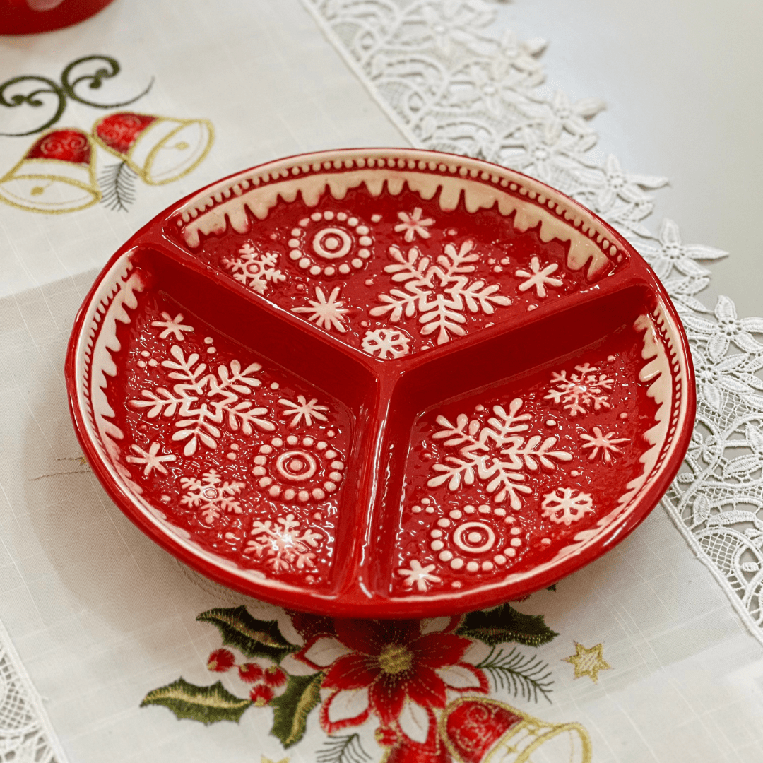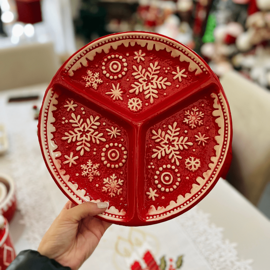 Sirva seus petiscos com estilo neste Natal usando a Petisqueira Natalina Floco de Neve. Com design delicado e 3 divisórias, ela é ideal para compor a mesa de ceia ou lanches festivos, adicionando charme e elegância à decoração natalina.