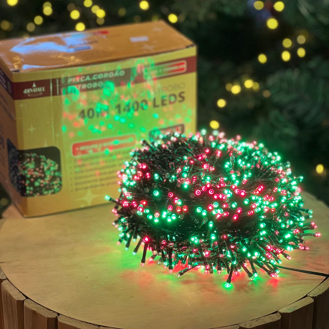 O Pisca Estrobo de 40 metros é ideal para destacar áreas externas com um visual natalino e cheio de brilho, tornando fachadas, árvores, muros, varandas e jardins muito mais encantadores nas datas comemorativas. Com 1400 LEDs distribuídos ao longo do fio, ilumina com intensidade nas cores vermelho e verde, criando um efeito festivo clássico e elegante. A função estrobo oferece diferentes modos de piscar, proporcionando dinamismo à decoração. Produto bivolt, próprio para uso externo, garantindo resistência e praticidade no uso ao ar livre.