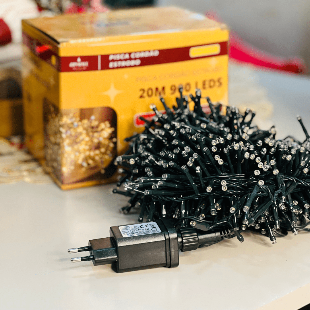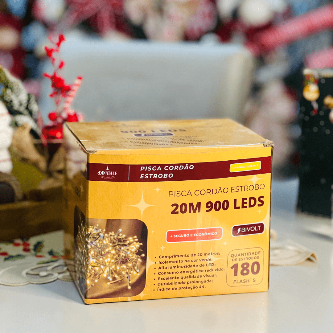 O Pisca Estrobo Fio Verde 20m 900 LEDs Branco Quente é ideal para criar uma iluminação natalina intensa, vibrante e moderna. Com efeito estrobo, oferece flashes dinâmicos que destacam a decoração, enquanto o fio verde se camufla perfeitamente em árvores e ambientes com folhagens. Seu comprimento de 20 metros garante excelente cobertura, sendo perfeito para áreas internas ou externas protegidas.