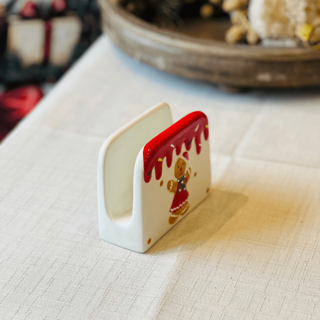 Adicione um toque especial à sua mesa posta com este porta-guardanapo natalino da linha Gingerbread. Produzido em cerâmica, ele une praticidade e charme, trazendo o espírito natalino para suas refeições com um design inspirado nos clássicos biscoitos decorados.