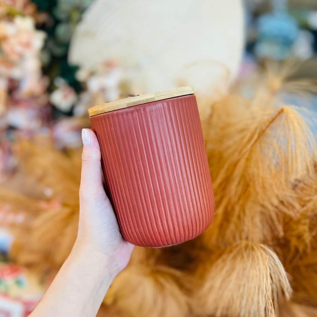 Potiche de Cerâmica Decorativo com Tampa em Bambu e Pegador de Corda Lines Terracota – 10x10x12,5cm
