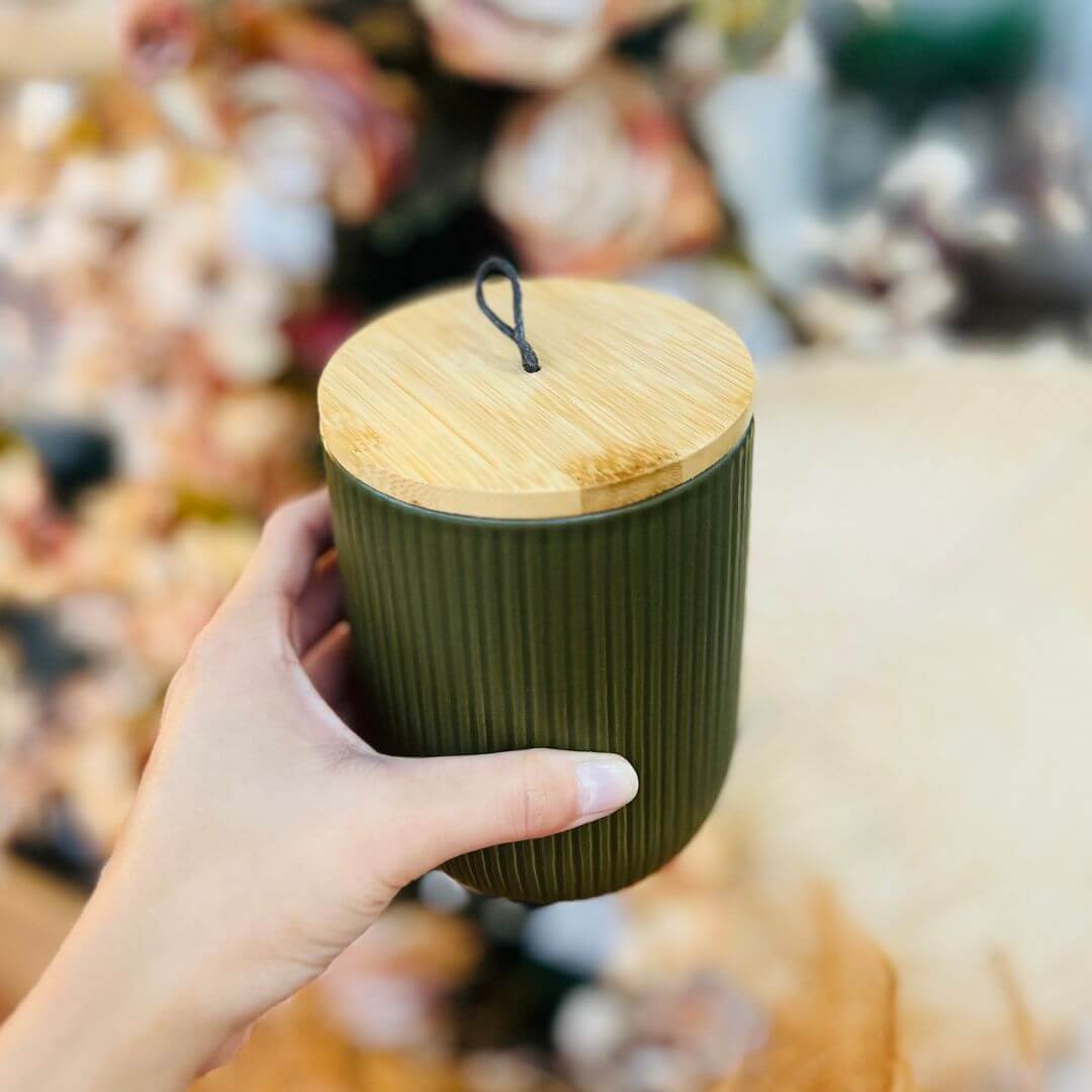 Potiche de Cerâmica Decorativo com Tampa em Bambu e Pegador de Corda Lines Verde – 10x10x12,5cm