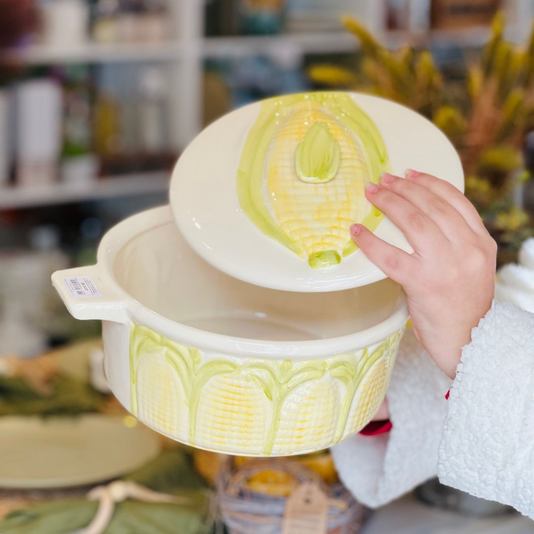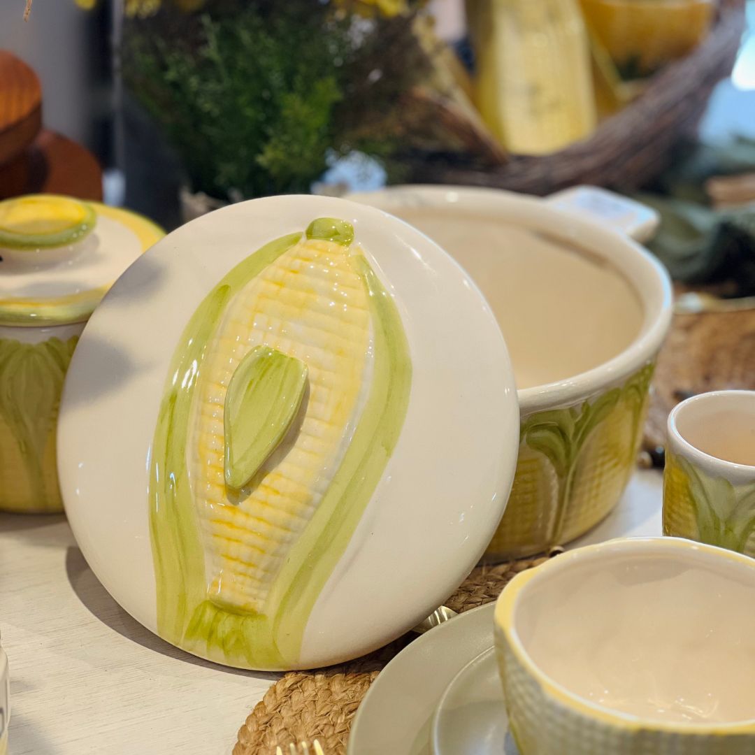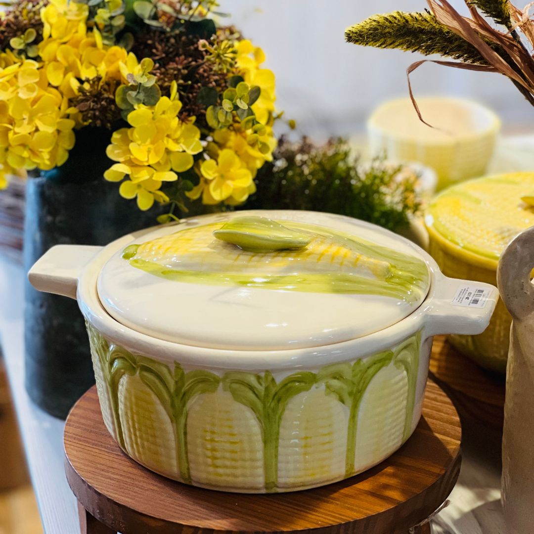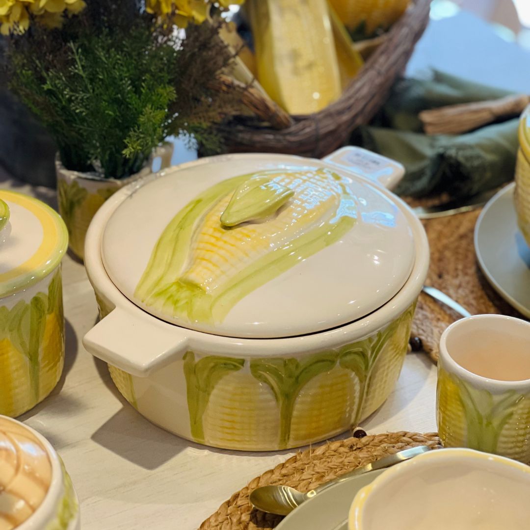 Sopeira temática de milho, decorada e pintada à mão com detalhes encantadores que valorizam o estilo artesanal. Ideal para servir sopas, caldos ou acompanhamentos de forma criativa e cheia de personalidade. Uma peça que combina funcionalidade com beleza na sua mesa.