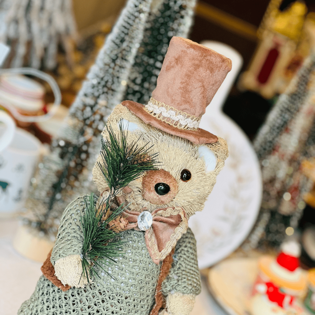 Adicione charme à sua decoração de Natal com este urso natalino, vestindo cartola marrom e detalhes verdes. Com 33 cm de altura e 18 cm de largura, é perfeito para mesas, aparadores, estantes ou como destaque próximo à árvore, trazendo um toque lúdico e festivo ao ambiente.