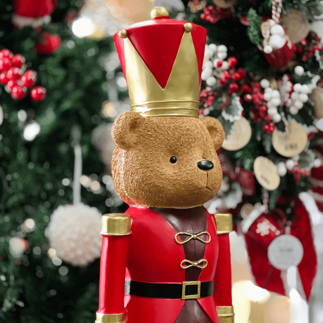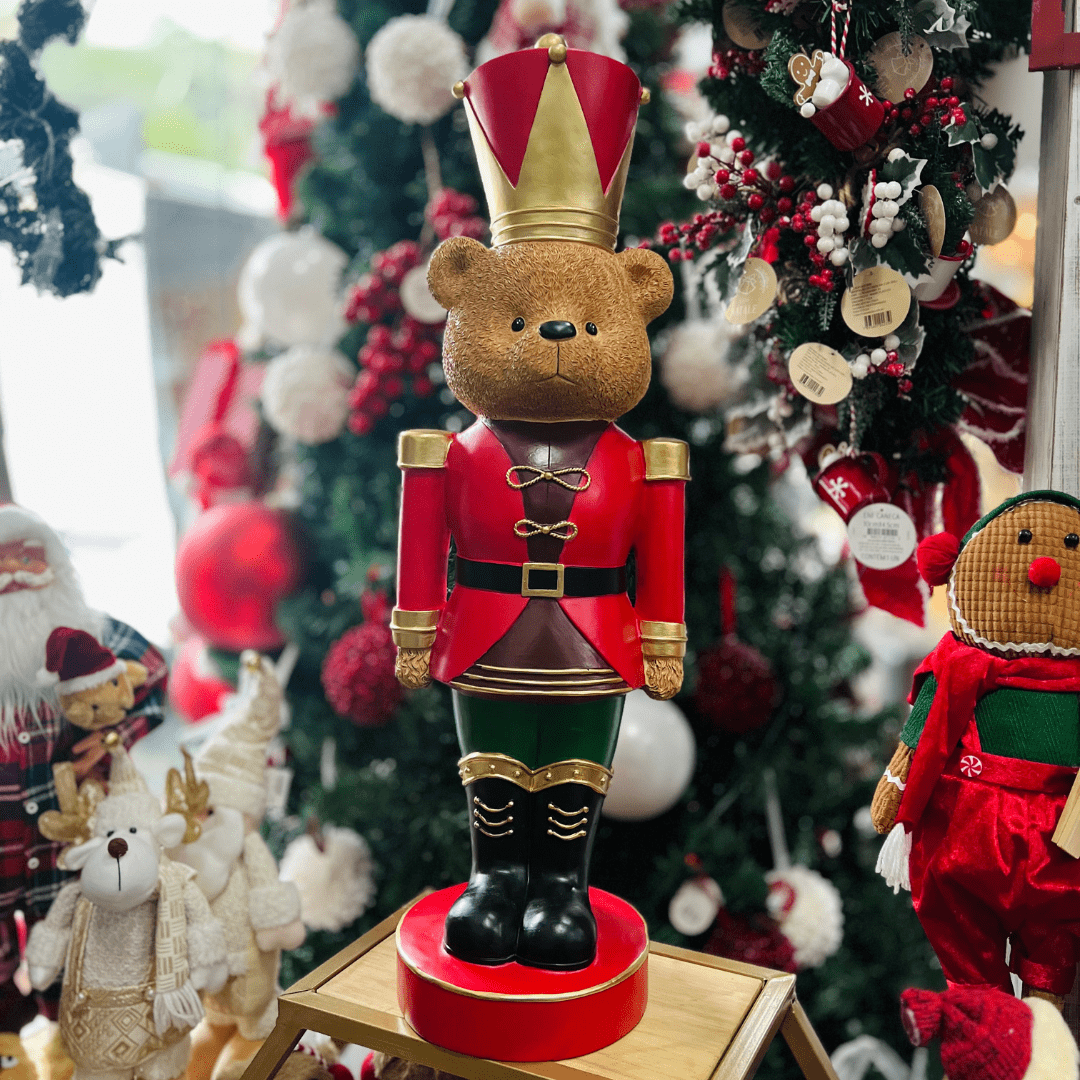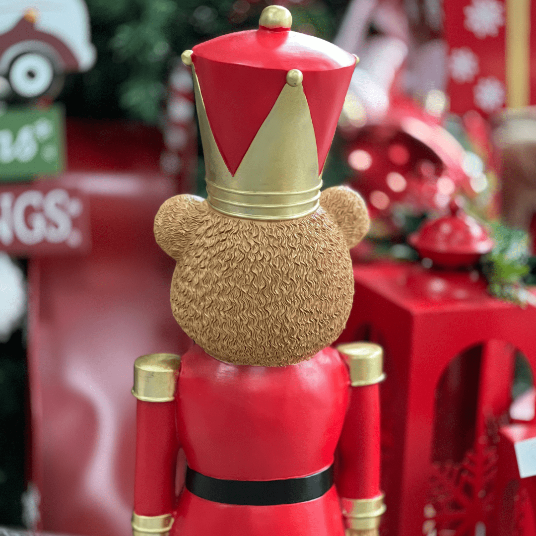 O Urso Natalino Quebra-Nozes Vermelho é uma peça marcante e sofisticada para enriquecer sua decoração de Natal. Com grande destaque em tamanho e detalhes, ele une a tradição do clássico quebra-nozes ao charme do urso natalino, criando um enfeite imponente que encanta adultos e crianças. Ideal para halls de entrada, salas amplas ou ao lado da árvore de Natal.