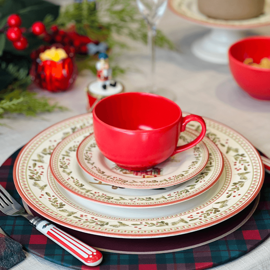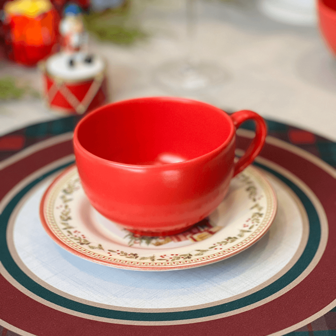 A Xícara de Chá com Pires Merry Christmas é perfeita para trazer o clima natalino para seus momentos de pausa e aconchego. Com design encantador, apresenta estampa temática de árvore de Natal com presentes, com cores vibrantes e detalhes delicados que tornam a peça única. Ideal para saborear chás, cafés ou infusões, seja no dia a dia ou em ocasiões especiais de fim de ano.