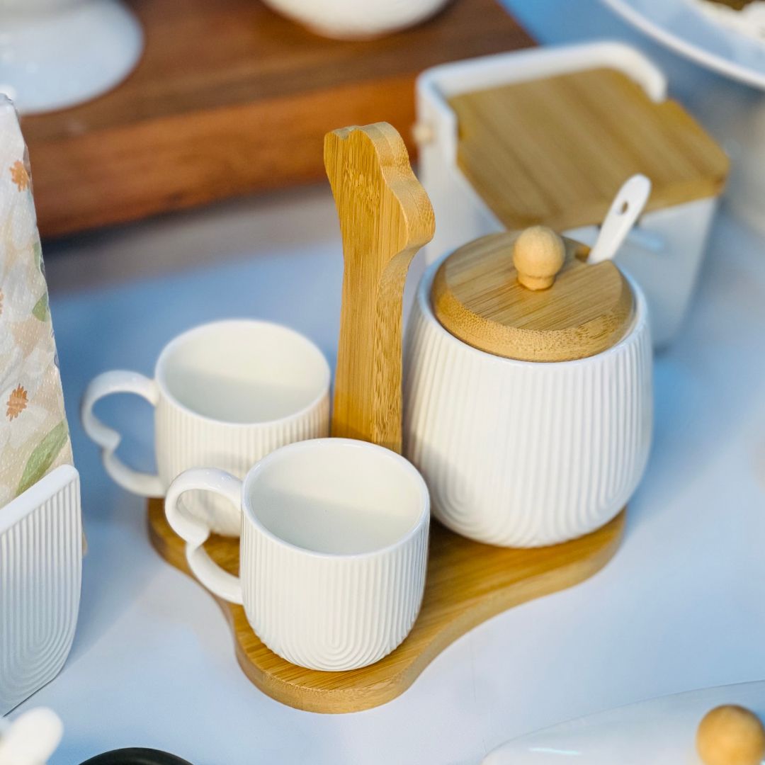 Conteúdo: 2 xícaras, 1 suporte correspondente, 1 Açucareiro e 1 Colher.